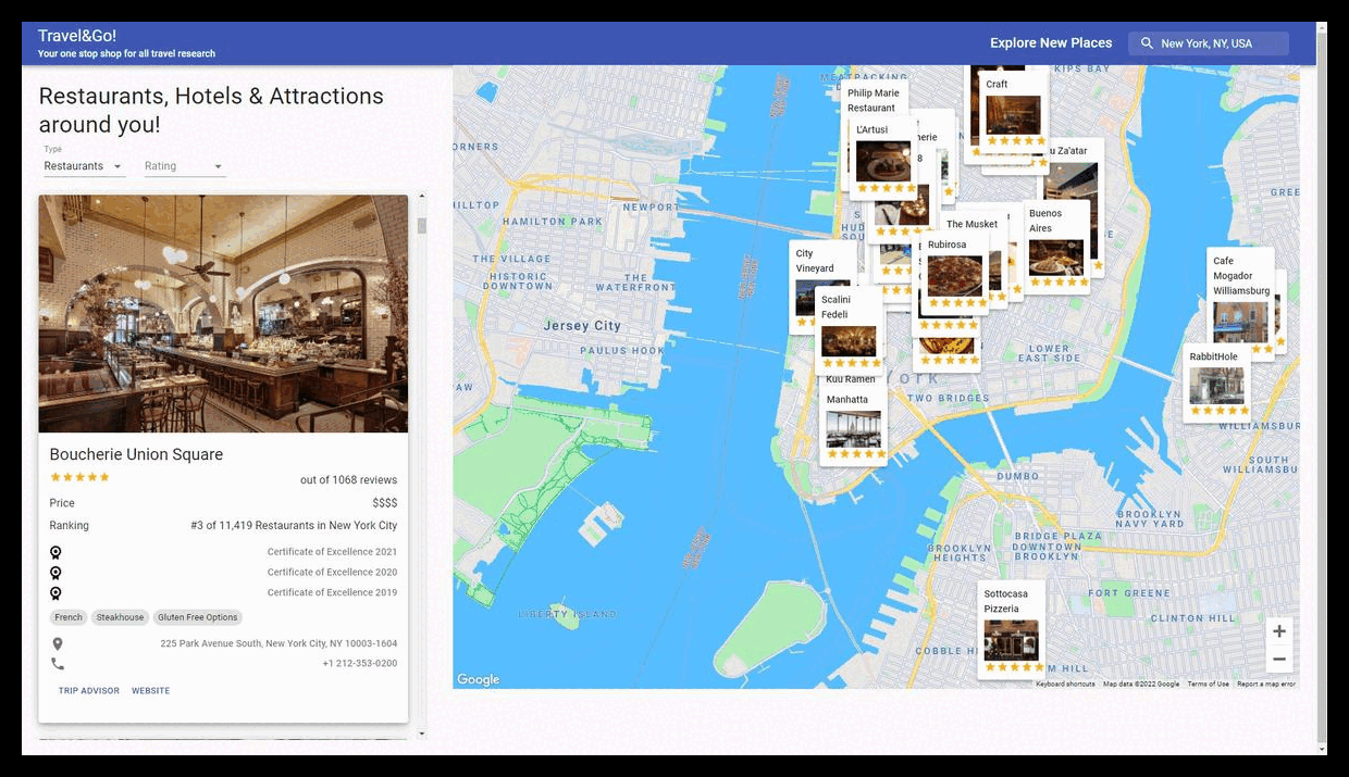A web-based complete interactive travel advisor application that is built on React and uses multiple GoogleMapsAPI and TravelAdvisor RapidAPI to recommend great restaurants, attractions, and hotels to users. The website is fully dynamic/responsive and allows users to sort different places based on their ratings. It also displays useful information such as any awards recieved, star ranking, address, and more.